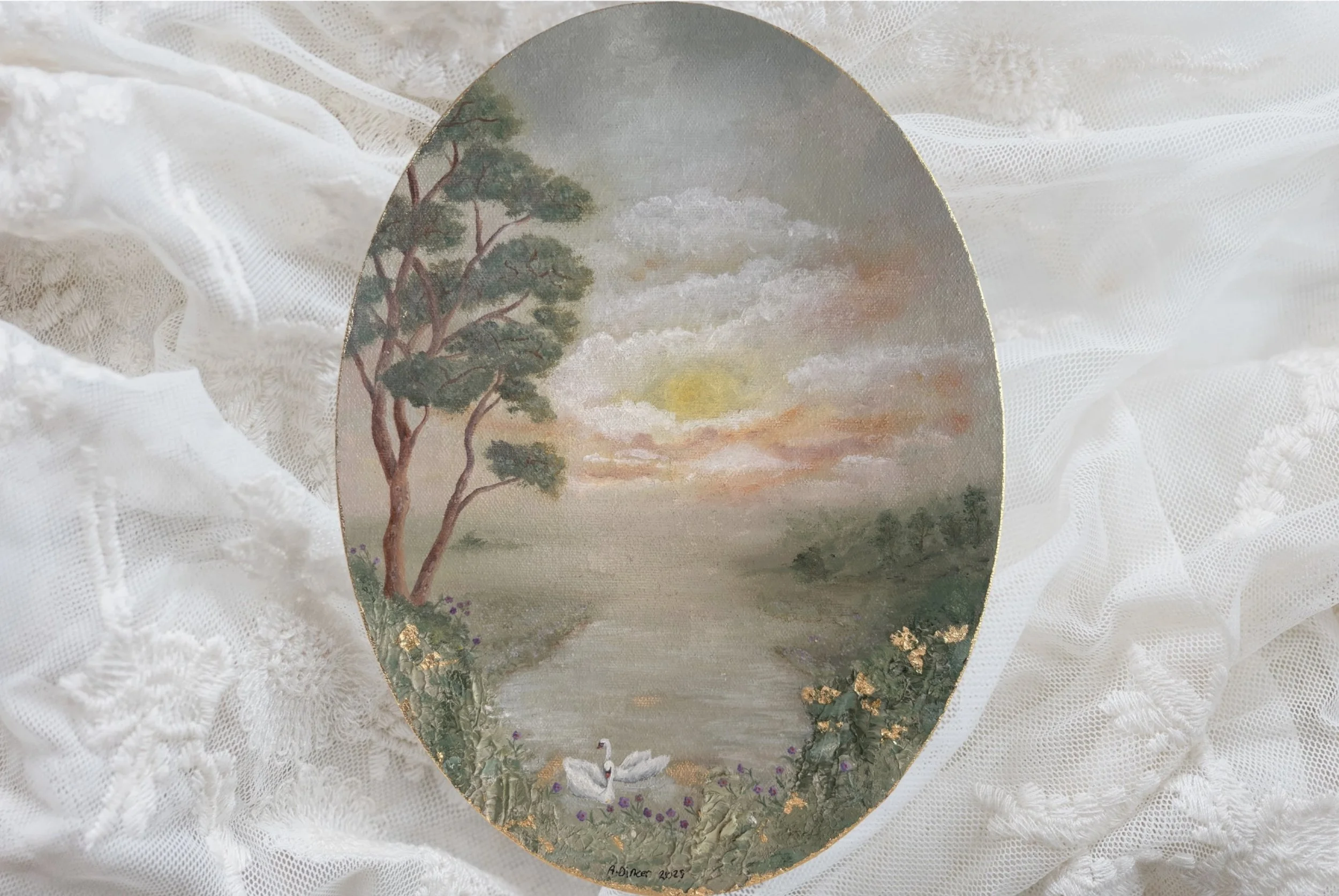 I often bring these natural elements together with gold leaf, adding a touch of light and sparkle to make each piece stand out. I moved to London last year and soon after took part in my first exhibition here. My paintings are like small journeys, inviting the viewer into the calm embrace of nature while exploring the magic of color and light.